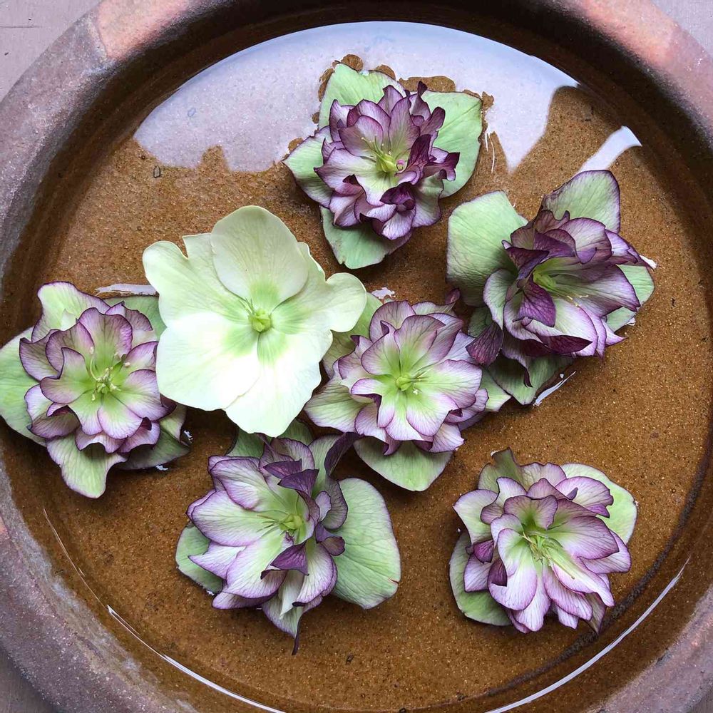クリスマスローズに新しいお花がたくさんついてきたので、先発隊は器に浮かべてみました。