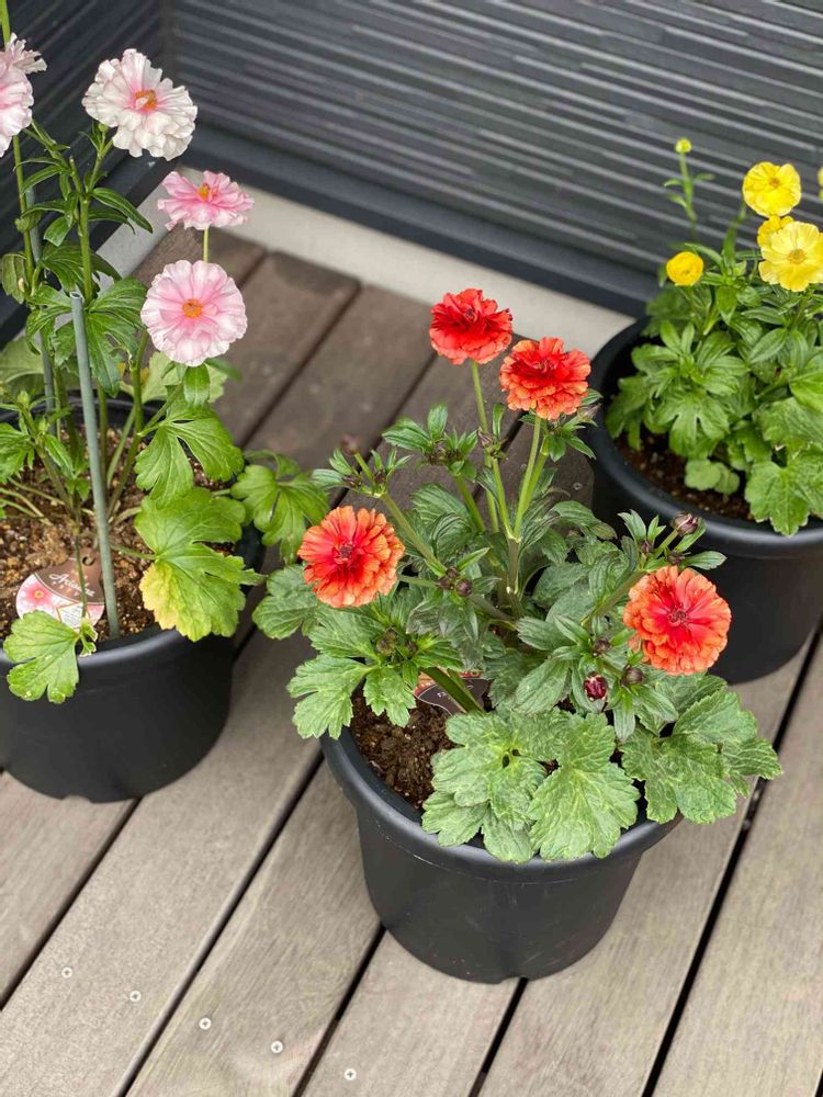 綾園芸さんのラナンキュラスラックス。一年越しにお迎え、キラキラの花びらが本当に可愛い、ピュタロスとハデスは4号ポットからアリアドネは6号のロング鉢で、お迎え、早速8号の鉢にそれぞれ植え替え。