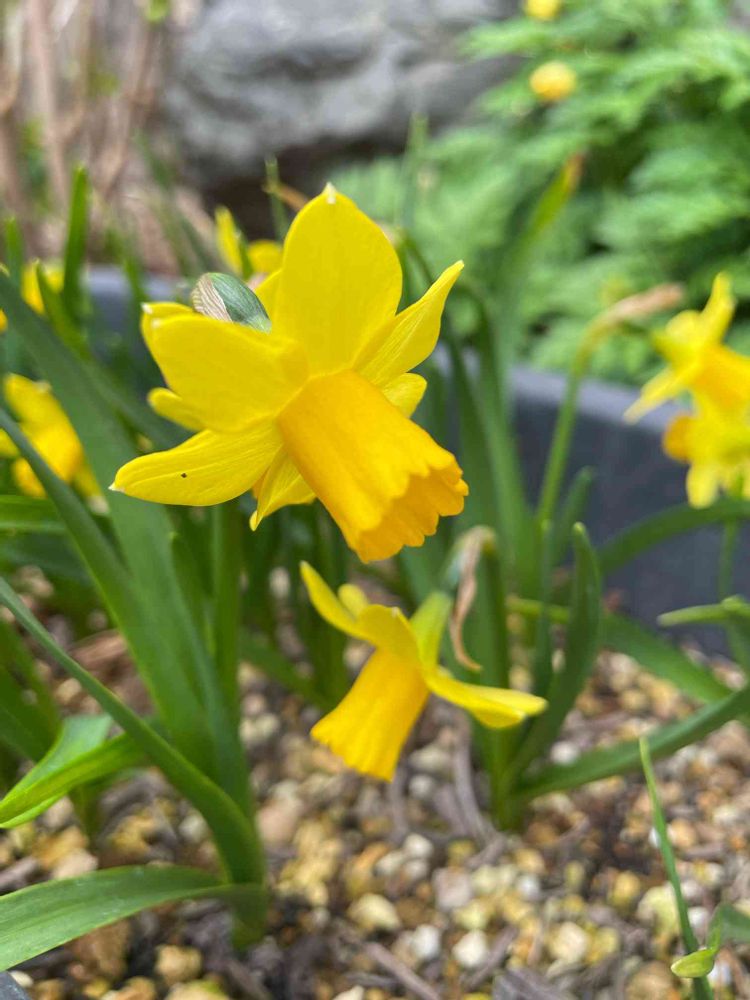 黄花の小型スイセンが満開です。でもでもでも、花の向きがバラバラです。なぜか?