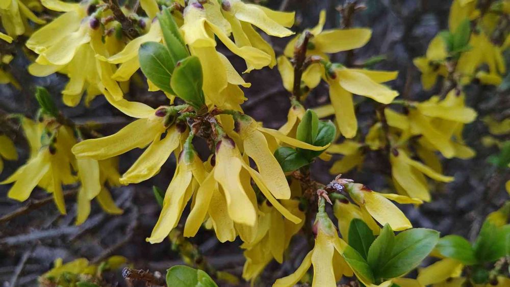 最近、散歩途中黄色い💛花を目にすることが多い。こちらは花と同時に葉っぱ🌿も。花弁長め・・・なので、シナレンギョウかな⁉️道路沿いの植栽、一気に黄色に染まりました✨