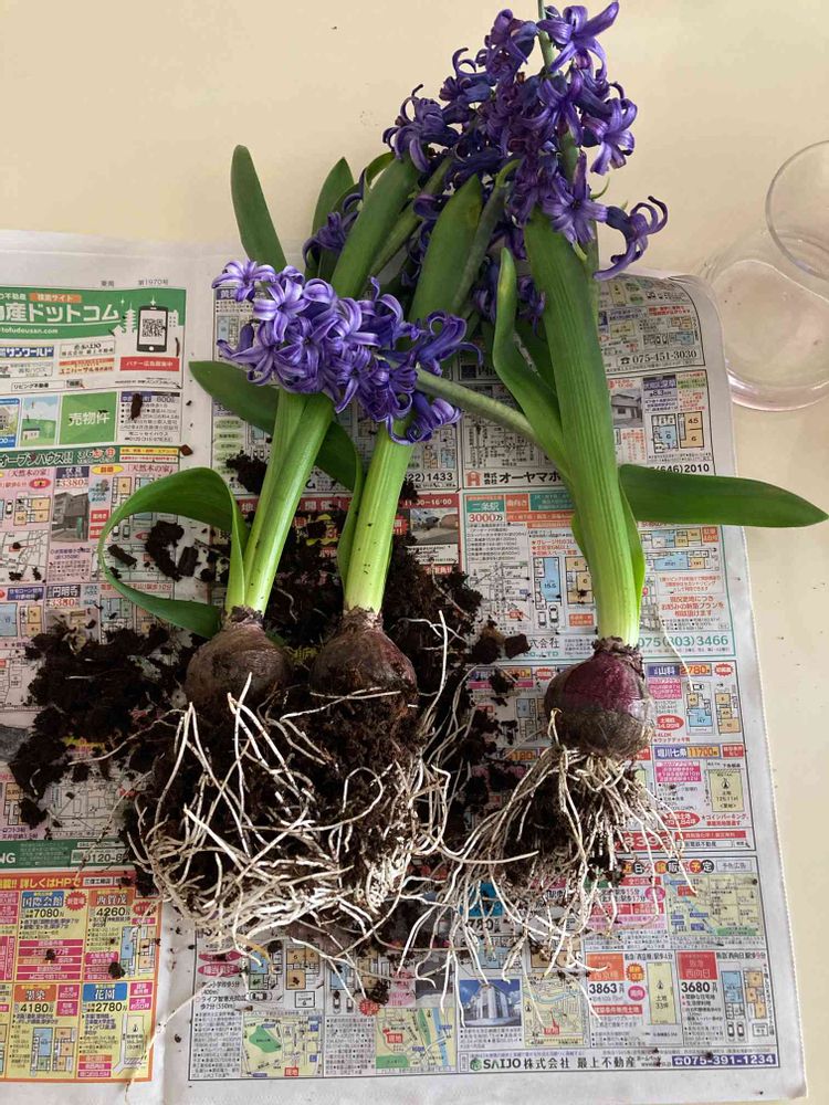 ヒヤシンスが弱ってきて頭を垂れるようになってきました。花も枯れてきたので植え替えようと鉢から抜いたところ、根が絡まり尽くしていました。その1