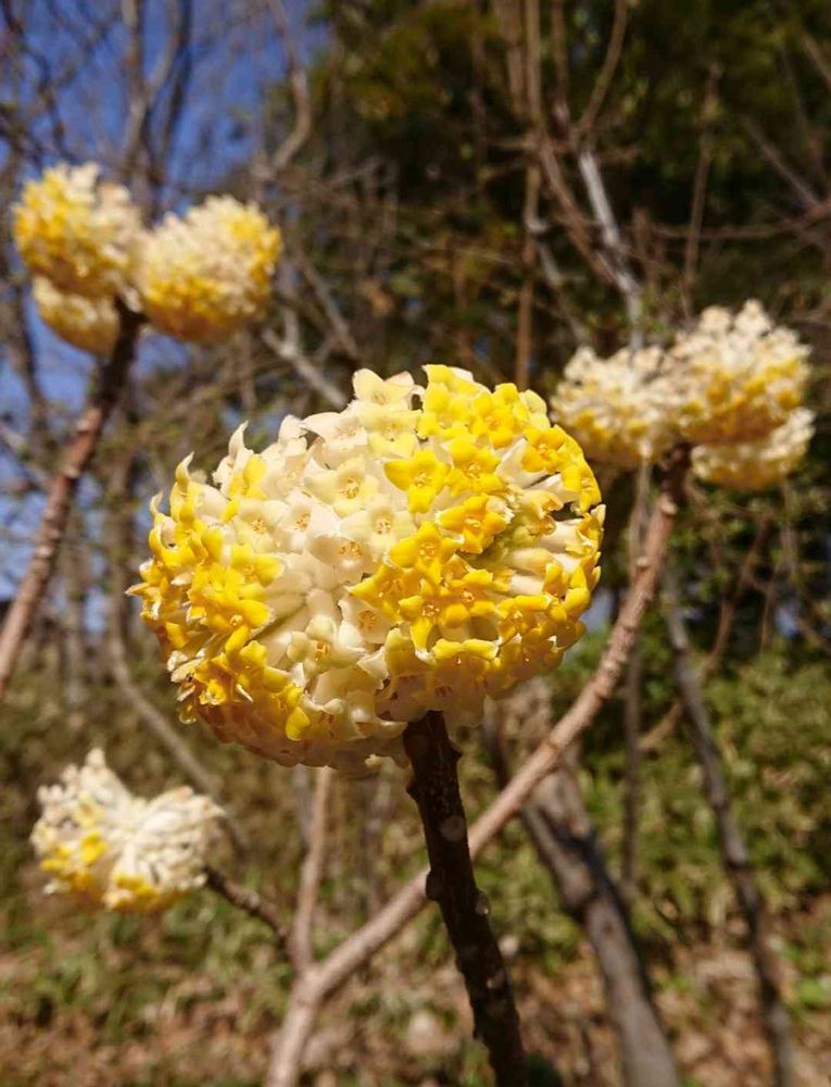 ジンチョウゲ科ミツマタ属の落葉低木。中国原産で1600年頃に渡来した。繊維が丈夫なため、コウゾ、ガンピと並ぶ三大和紙原木で和紙の原料として利用されるため栽培されるが、近年は栽培が減少し、かつて栽培されていた木が山地で野生化している場合もある。花が美しいため庭木や公園樹としても植えられる。花芽が大きいので花期以外でもよく目立つ。花期は3~4月、葉が出る前に甘い香りを放って花が咲く。黄色い花は、小さな花が30~50個集まって手鞠状になり、外から内側に咲き進む。花に花弁はなく花弁に見えるのは萼。萼筒の先は4つに開き、外側には白い絹毛が密生する。葉は長楕円形~披針形で、裏に絹毛が密生する。果実は6~7月に熟す。毛のある緑色で、枯れた萼に包まれる。