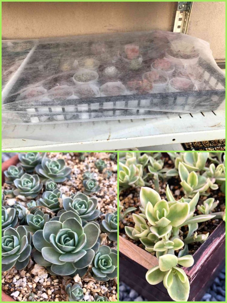 また一緒に出来た葉挿しポットも左隣に置いて、不織布をかけてます🌱