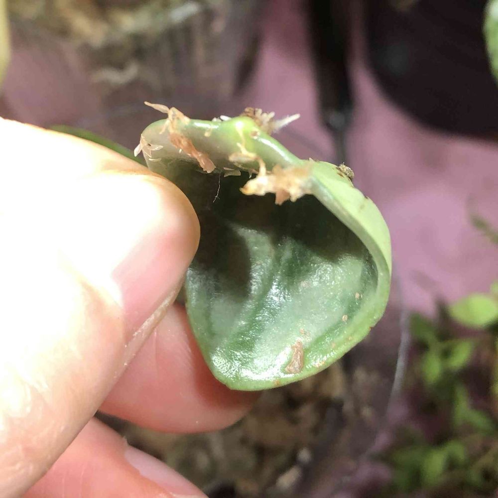 スイカぺぺ、水やりの時にぽろっととれた葉っぱを水苔の上に置いておいたら根っこでてた〜ラッキー😍