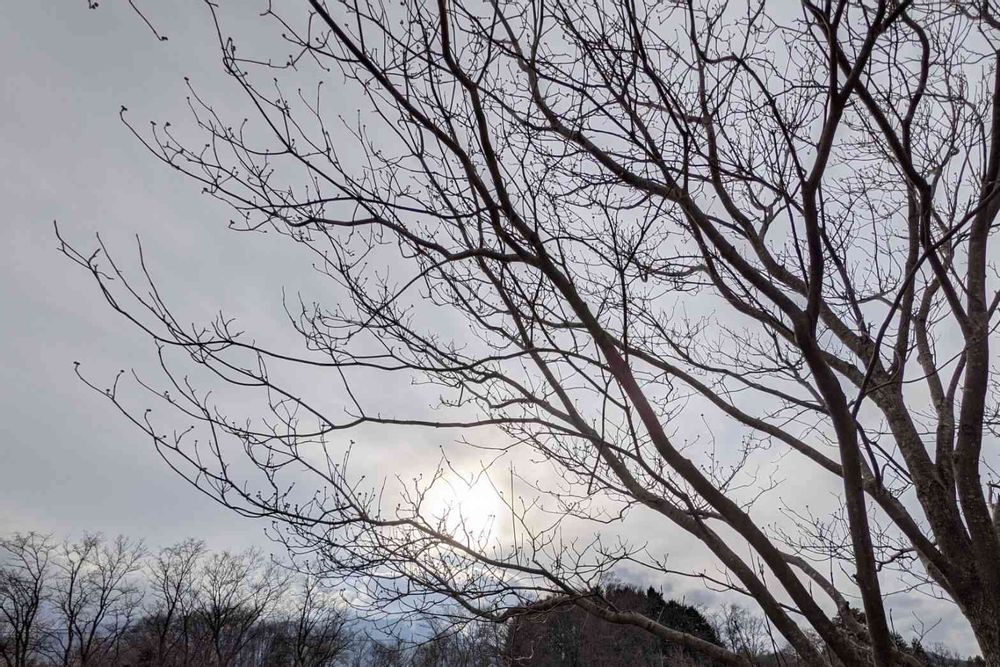 白のハナミズキ、今日も日が暮れて、開花まであと一ヶ月半、蕾を育んでいきます。