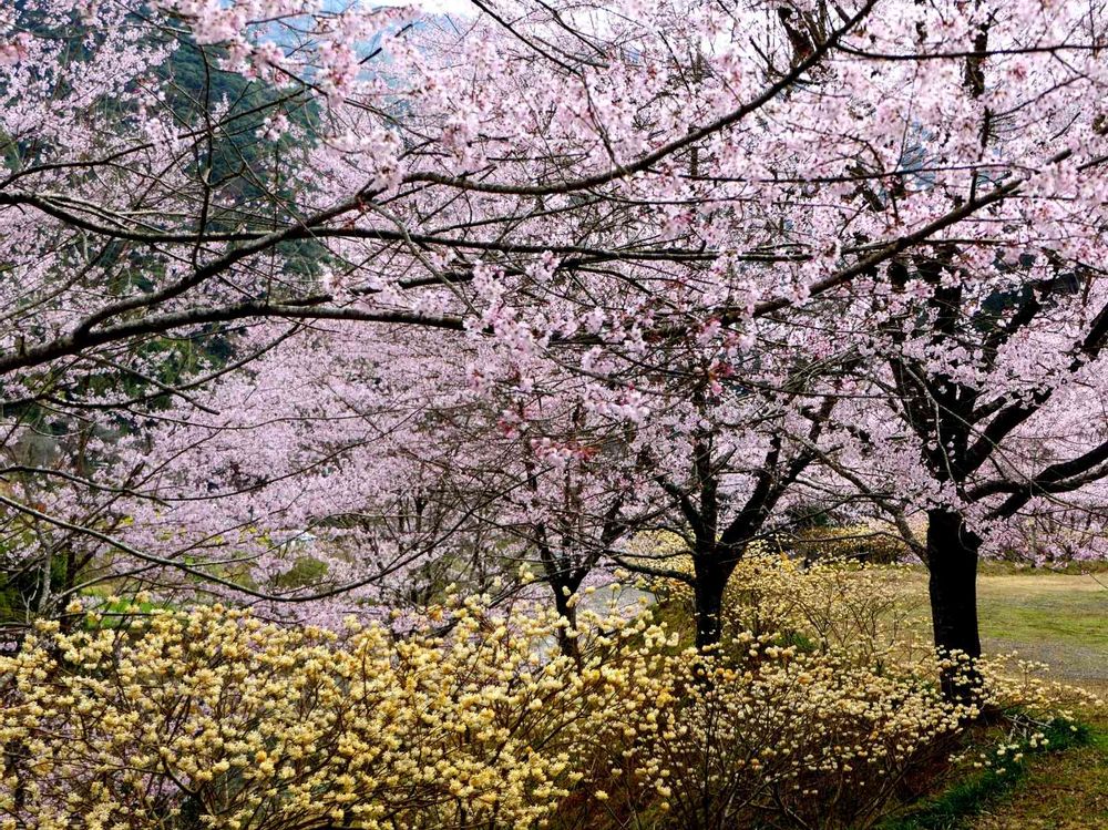 ミツマタとエドヒガンザクラが、コラボで満開になっています🎵