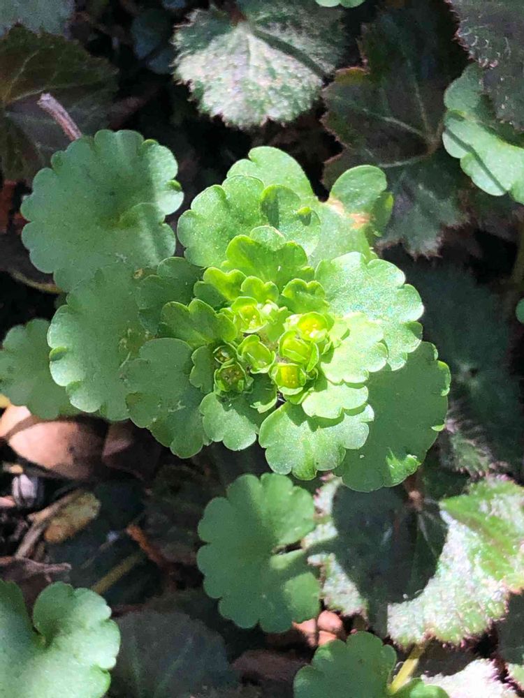 ヨゴレネコノメソウ、濃い緑の葉に灰色を帯びた
