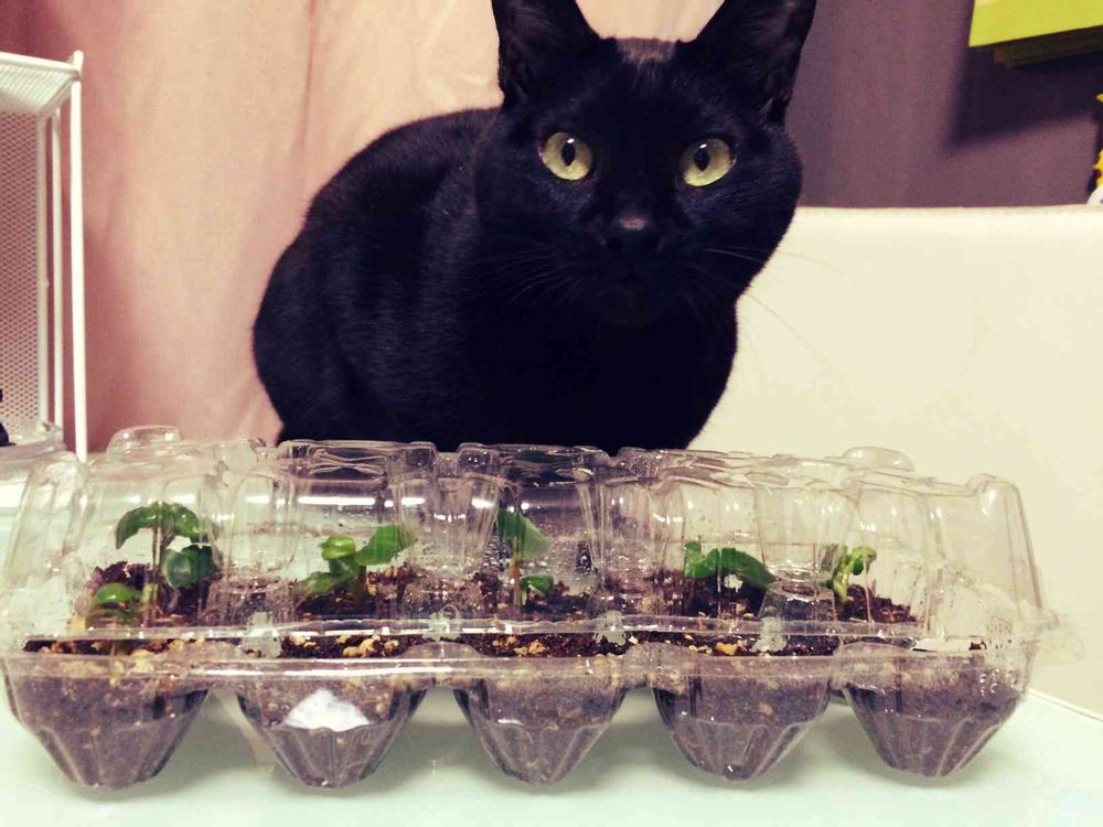玉子ケースで発根お試ししてます(^^)興味深々で作業を見守ってた猫です。