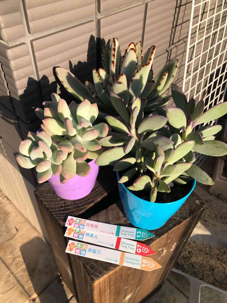 大きな多肉が良いものかどうなのかわからい私ですが、10cm超の月兎耳に惹かれ、欲しかった桃美人と紫の縁どりが気に入り、紫蛮刀をお持ち帰りしました。