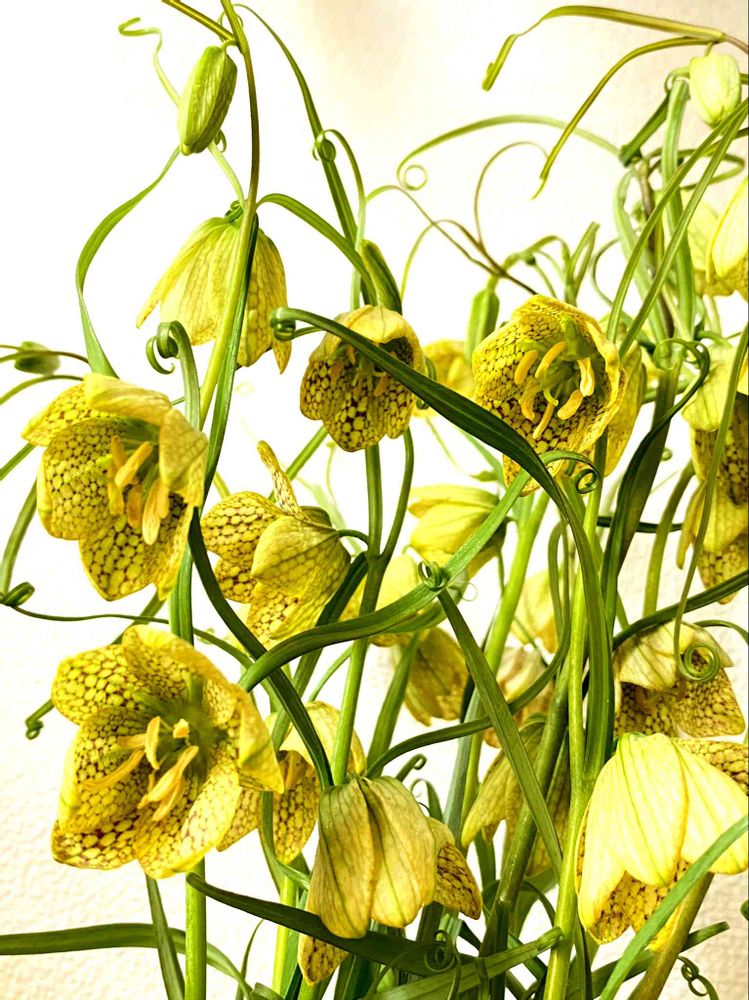 この前、花屋さんでフリチラリア メレアグリスと言う赤紫色に白いパイソン柄🤭網目模様の花が球根ごと売ってあって〜