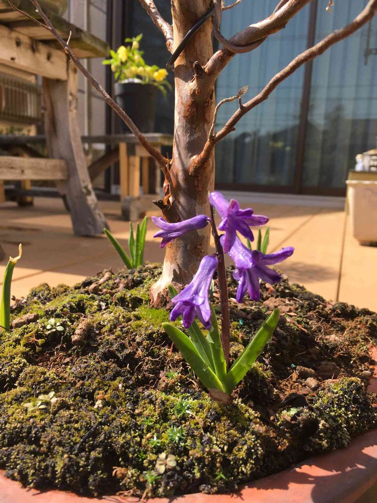 姫シャラ盆栽の足元にヒヤシンスの花が