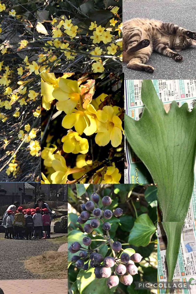 キヅタの黒い実と対象的に赤と黄色の帽子のお子たちの賑やかな観察が気になります……(*˘︶˘*).。.:*♡