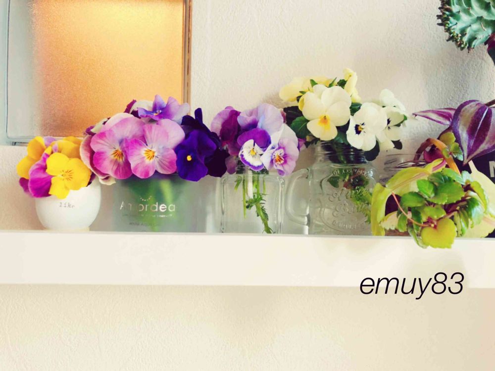 庭の伸びてしまったビオラを今日カット✂️しました😊カットした花たちがかわいそうだったのでおうちでビンに飾りました🌸