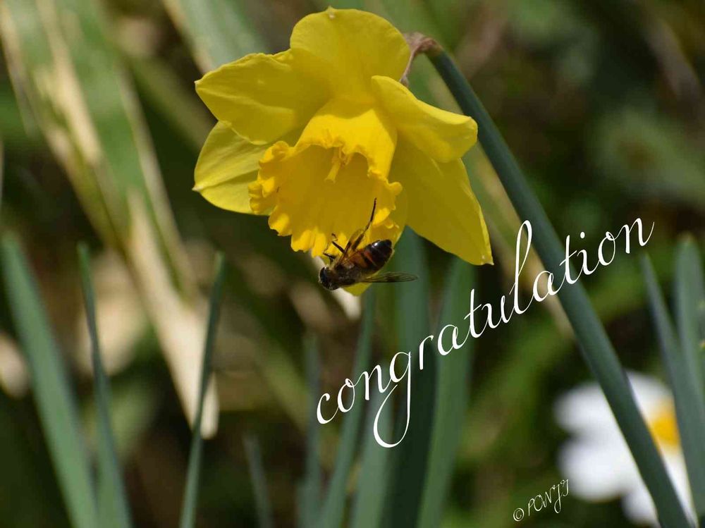 ビタミンカラーのラッパスイセンに、蜂サンも参加の㊗️お祝いpostです😃💕👍️