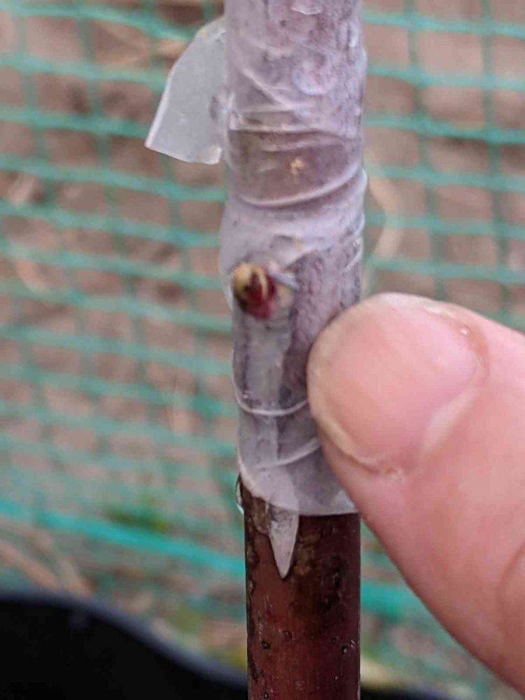 花山吹のスタンダード仕立て。芽接ぎが成功してメネデールテープを突き破りコンニチハしてきた。
