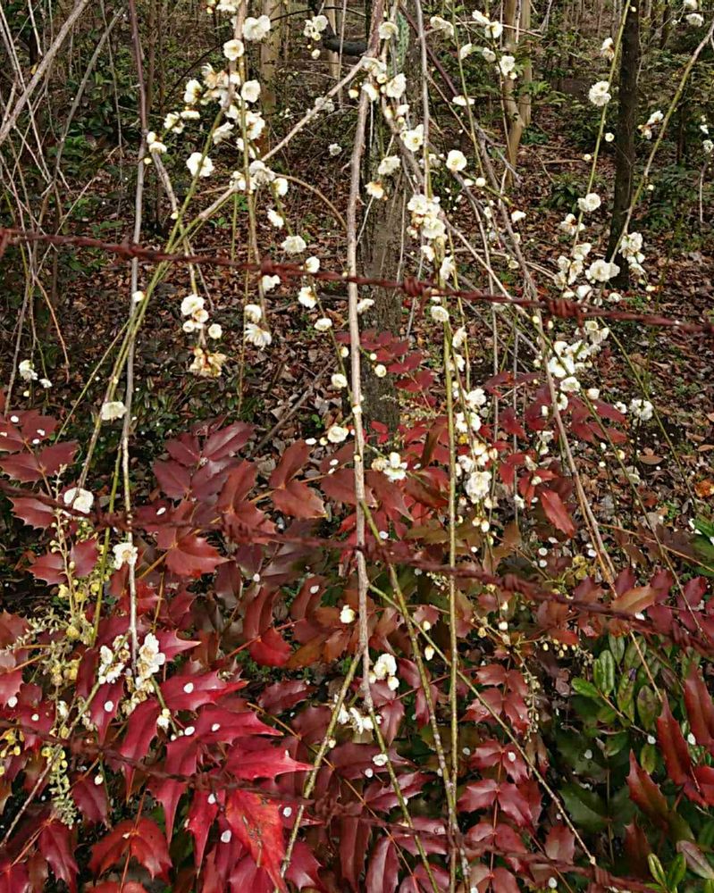 ヒイラギナンテンの赤い葉の上に垂れ梅の白い梅が綺麗です🎶