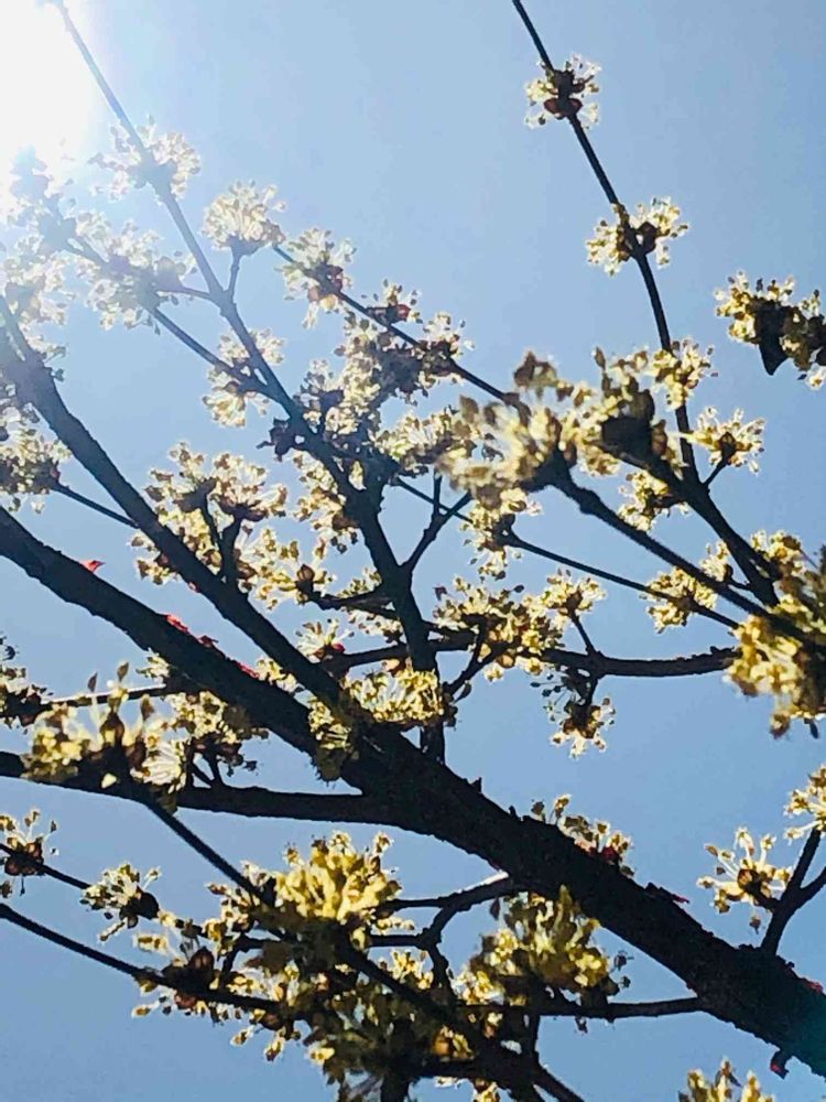 春の陽射しを浴びる「サンシュユ」のお花です✨
