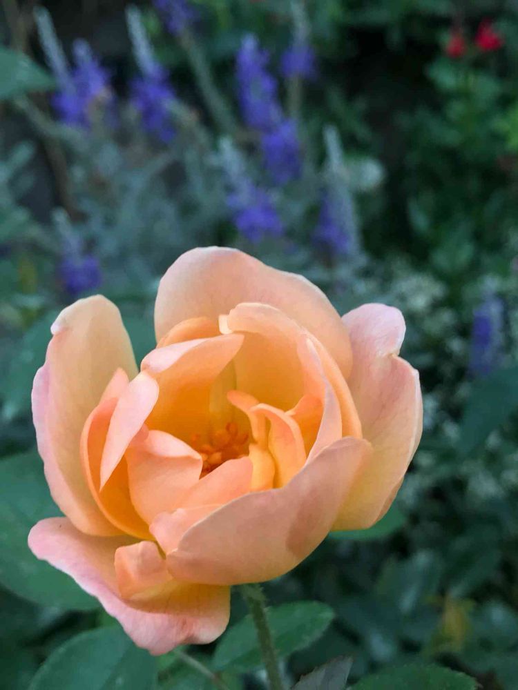 ふんわりと咲いた優しい色の🌹さん素敵だね~バックにいるブルーさんはベロニカかな?