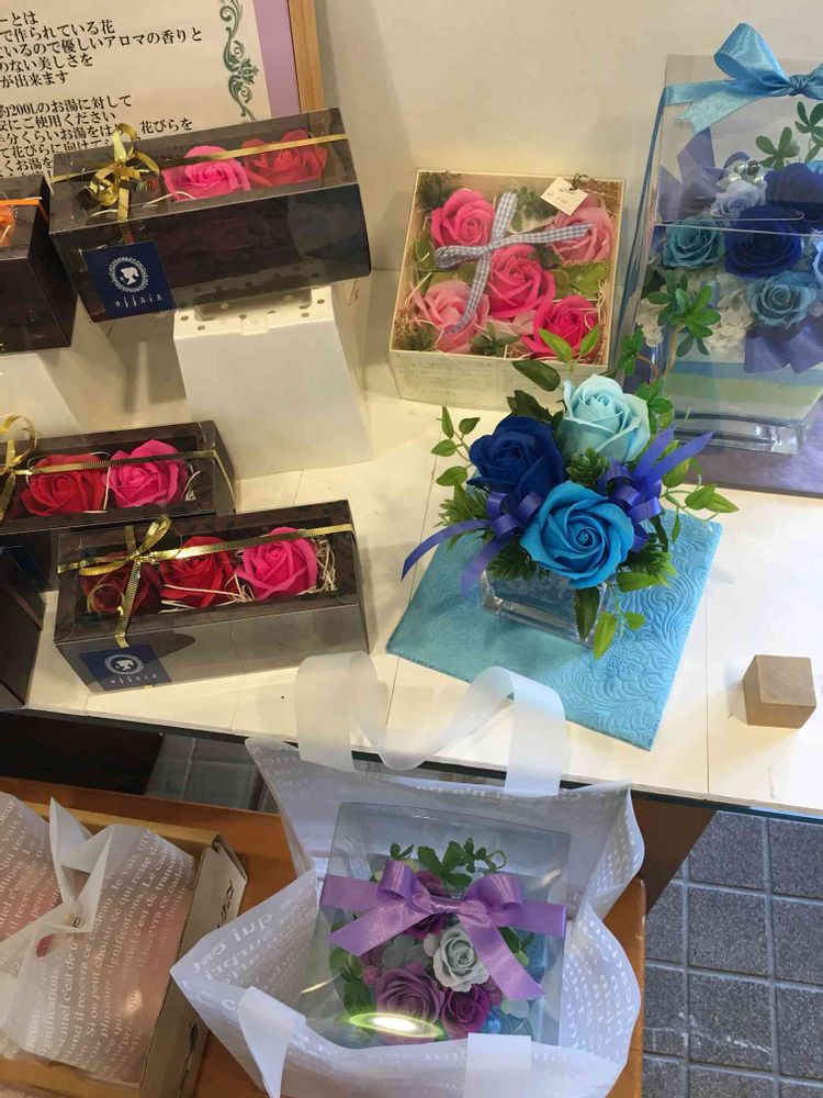 プリザーブドの花屋にて。赤だけでなく貴重な青もある。家内は7年前買ったプリザーブドの薔薇の置物の交換に来た。薔薇の美しさは永遠に留め置きたいのは分かるが…。