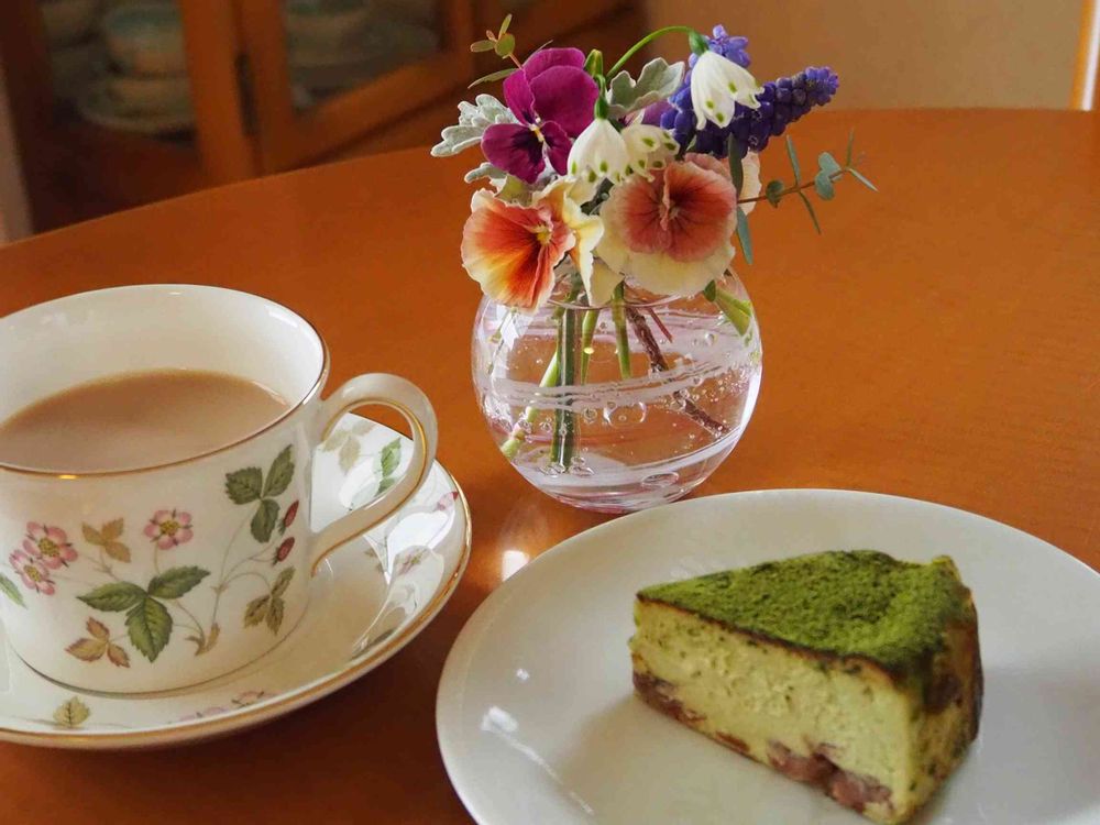 こんばんは💛ミルクティーの色あいとウェッジウッドのワイルドストロベリーのカップ&ソーサーに、速攻で反応してしちゃいました~!!😊😆この色合いは、ポーションじゃなくてミルク(牛乳)ですよね?!まさにイギリス!😄😆カップも紅茶用の幅広のもので形がステキ~🤗🥰かわいらしいお花とおいしそうな和洋ミックスのチーズケーキで、最高のアフタヌーンティーですね。私まで幸せ&いやされました。ありがとうございます!