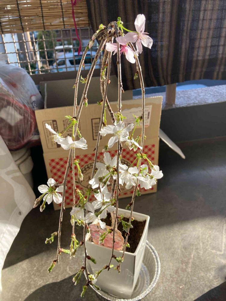 こちらで買った枝垂れ桜の鉢植えが咲き始めました❗️