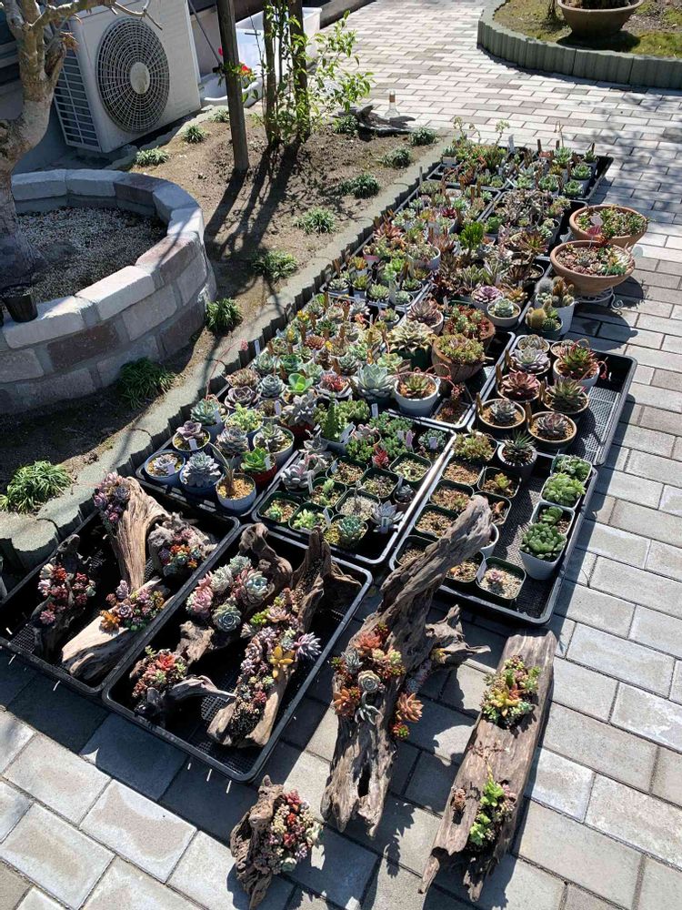 広い庭,多肉植物いろいろ,多肉植物と流木の寄せ植えの投稿画像