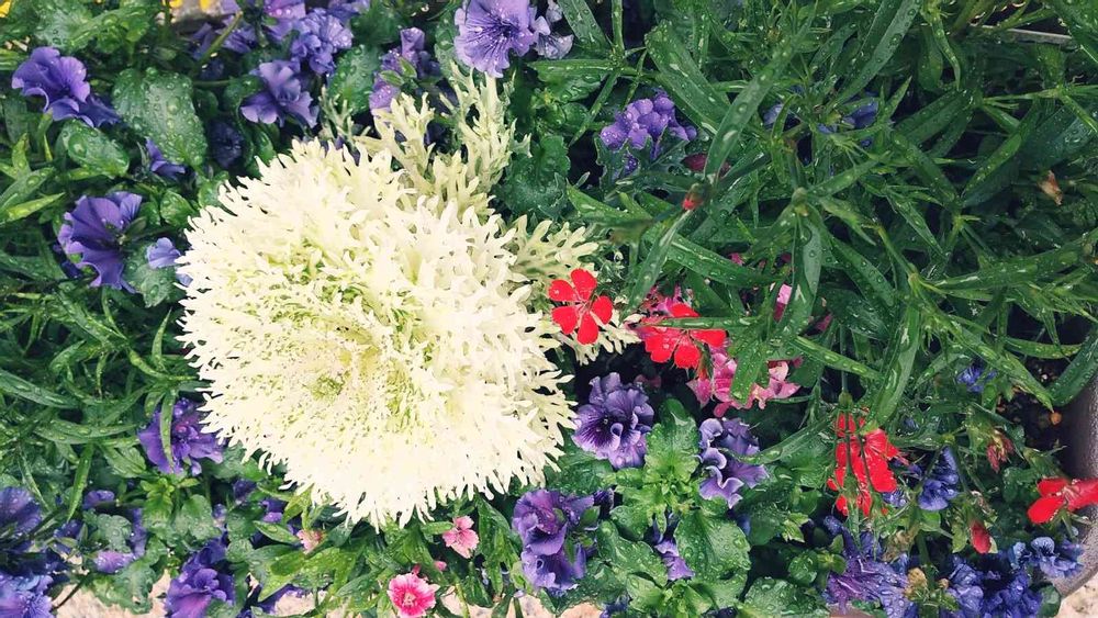 仕事終わりで帰りに🤍白色葉牡丹と💜紫ビオラちゃん❤赤撫子ちゃんがお疲れ様🙇♀️💜🤍❤