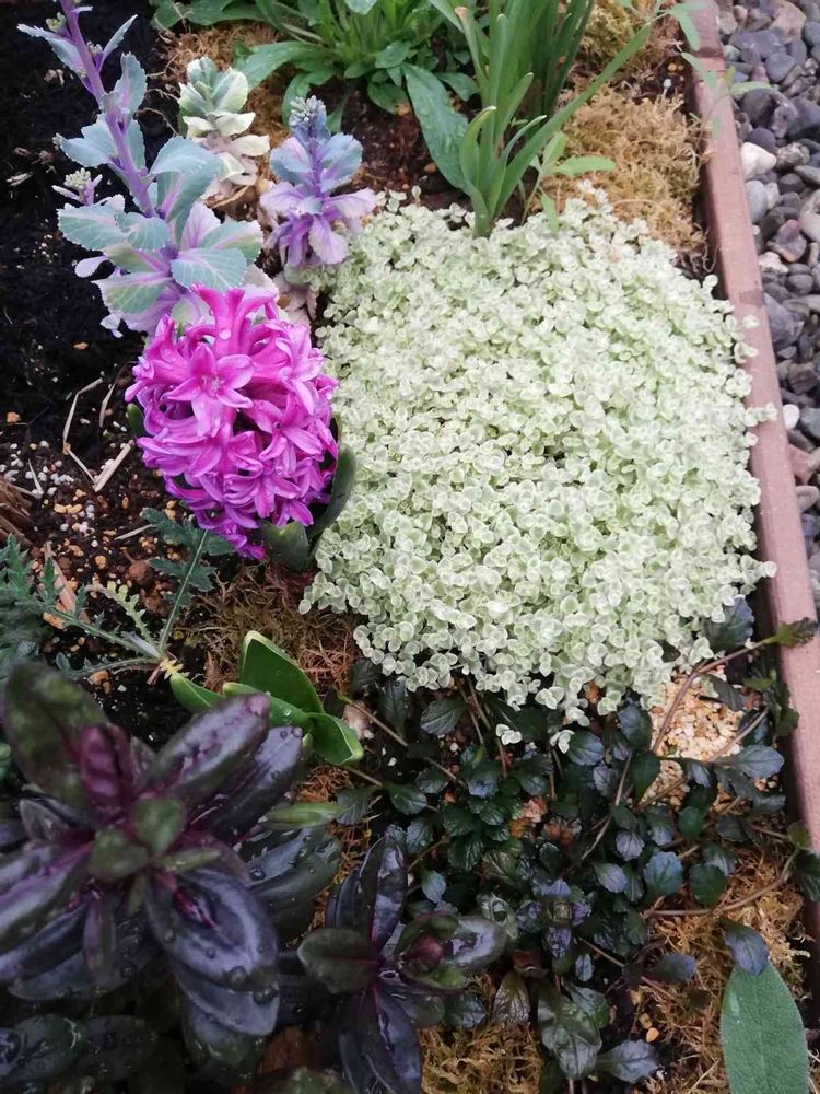 セダムが増殖、アジュガはランナー❓を伸ばし、ベロニカは銅葉が深緑に、ヒヤシンスは香りを、葉牡丹は蕾を、オダマキの新芽が、、、そして僕は☕😃🚬