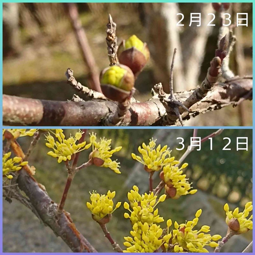 サンシュユのこの黄色い花は、庭の花の少ない今の時期、とてもよく目立ちます😊