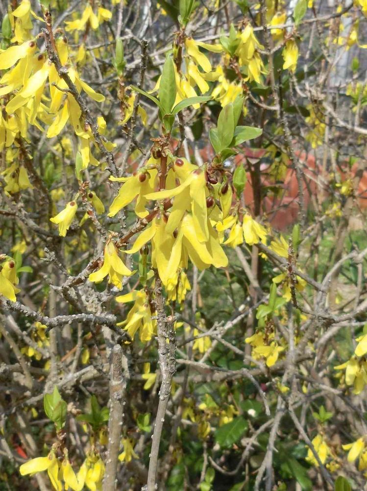 レンギョウ(連翹)が黄色い花を枝いっぱいに咲かせています。