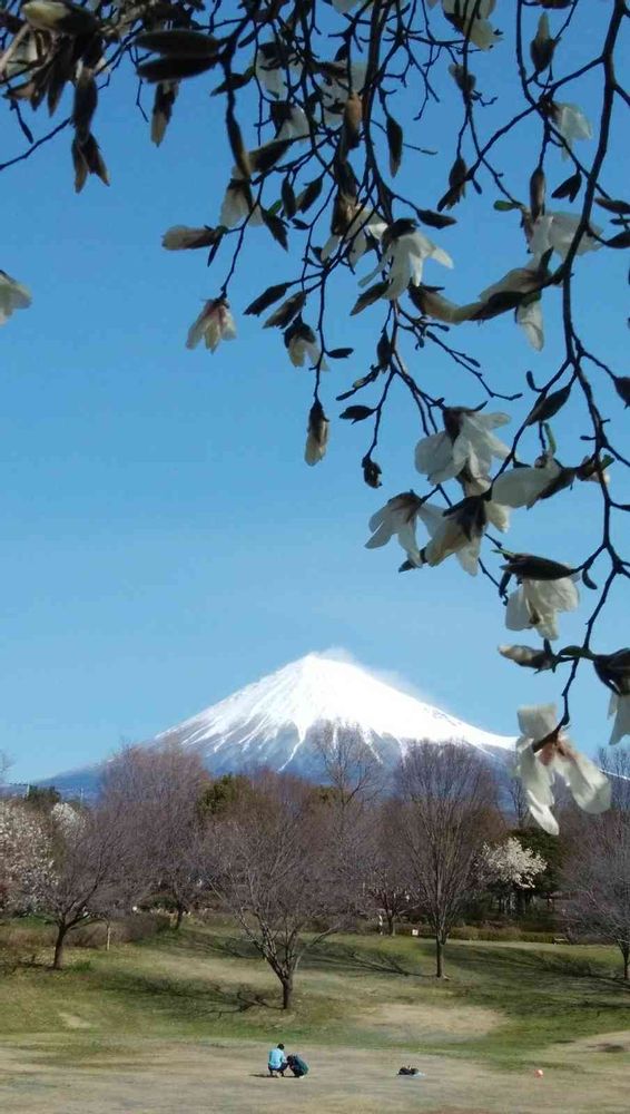 @かこ様、富士に雪、青空にこぶしの花、公園の芝がグリーン この写真 は、