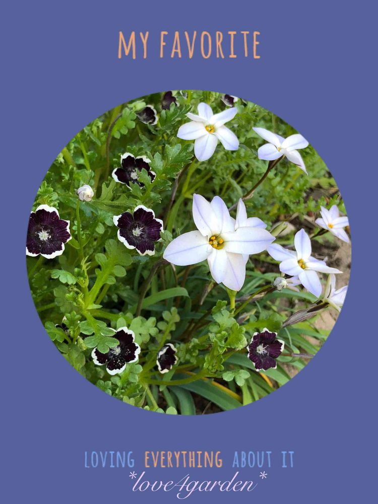 地面にばら撒いたネモフィラペニーブラックが満開になり、ハナニラと仲良く共演中。