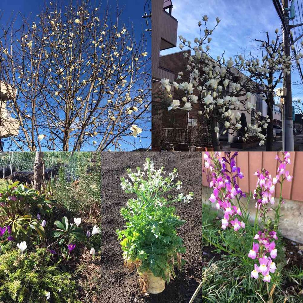 今日は強い風でしたが、モクレン、コブシ、大根の花まで咲いてます。