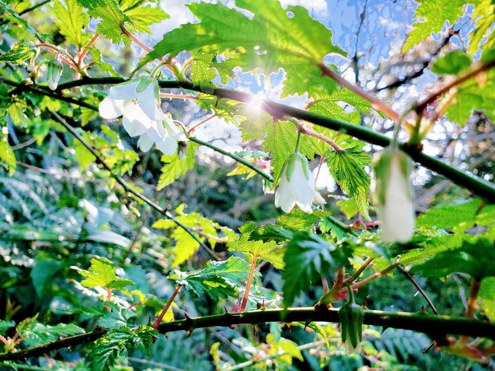 汗をかくくらいの陽気で、白い花を見つけてさて?これ何?じっと観察😁この葉っぱカジイチゴにそっくり!でもトゲがある?ということでモミジイチゴにたどり着きました‼️