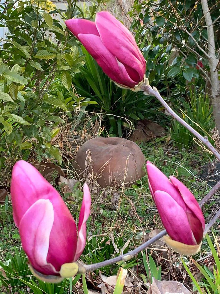 木蓮のお花もですが、奥に見える。丸い石?うちの敷地にまあるい白くて大きなキノコ生えます。今時期ではありませんが。