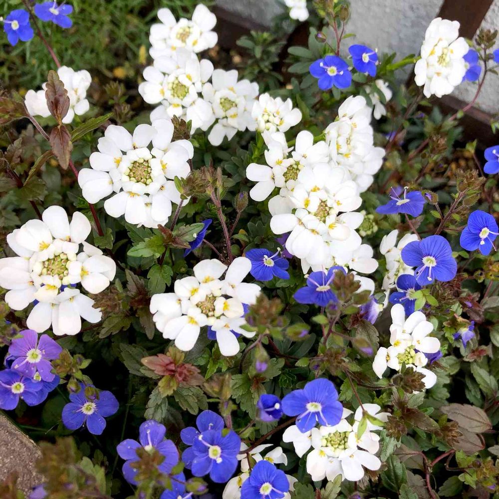花壇の中で自然と混ざり合って、青花と白花のコラボに🥰