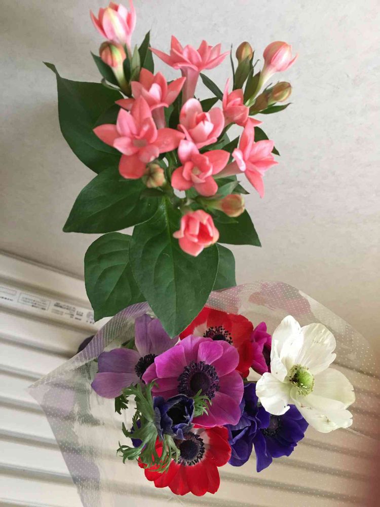 珍しく娘が続けて花を💐買ってました。アネモネ、10本で400円だったそう。春の溢れる花🌸を見ると欲しくなってしまうそうです。前のブバリアと一緒にグラスに入れました。春が伝わってくるようです^o^。