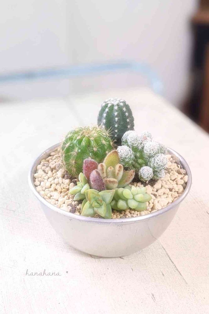 アルミの器にサボちゃんand多肉さんがよーく合いますね♫とっても可愛いです❣️❣️お店の売り物のようです♫