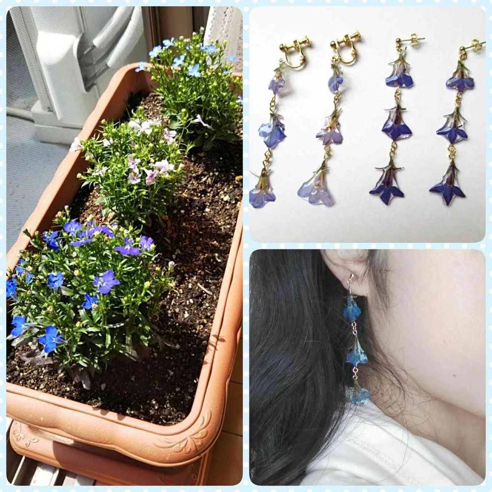 ロベリアの押し花を使った3連ピアス・イヤリングも根強い人気があります。