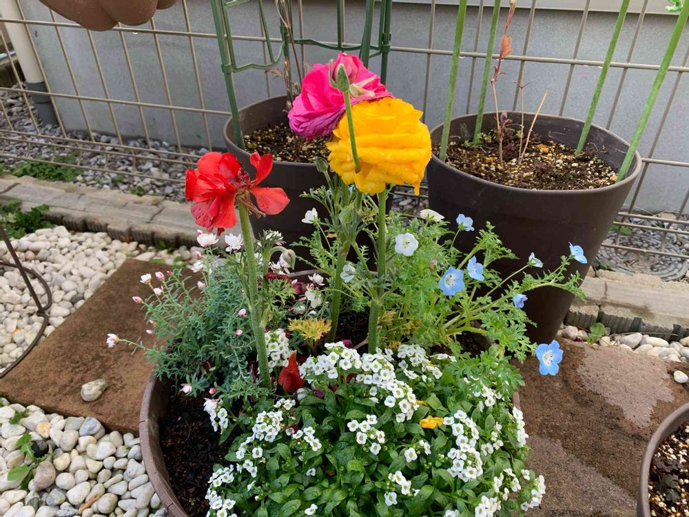 ラナンキュラスとネモフィラと花かんざしの寄せ植え