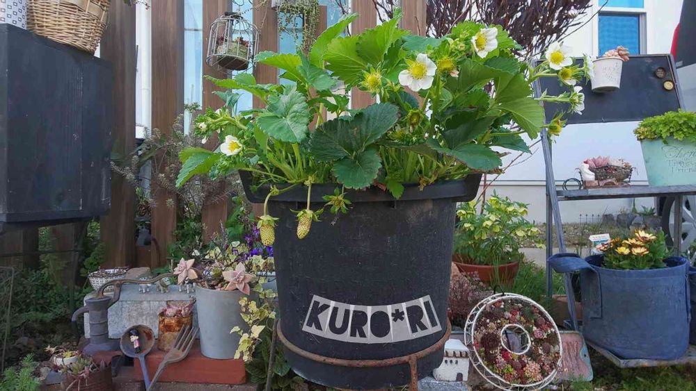 🍓の実はまだなんで華やかさに欠けるかなぁと(いちごの日の投稿は皆さん可愛くて賑やかなpicが多いので)雑貨多めコーナーに鉢ごと移動しました🤣