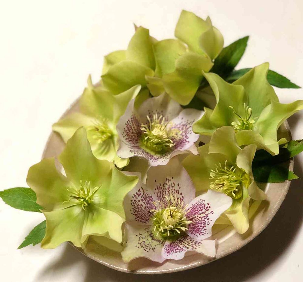 こんにちは😊クリスマスローズ咲き終わった花並べて飾ると可愛いですね🌸薄グリーンとピンクの色合いが良いですね✨