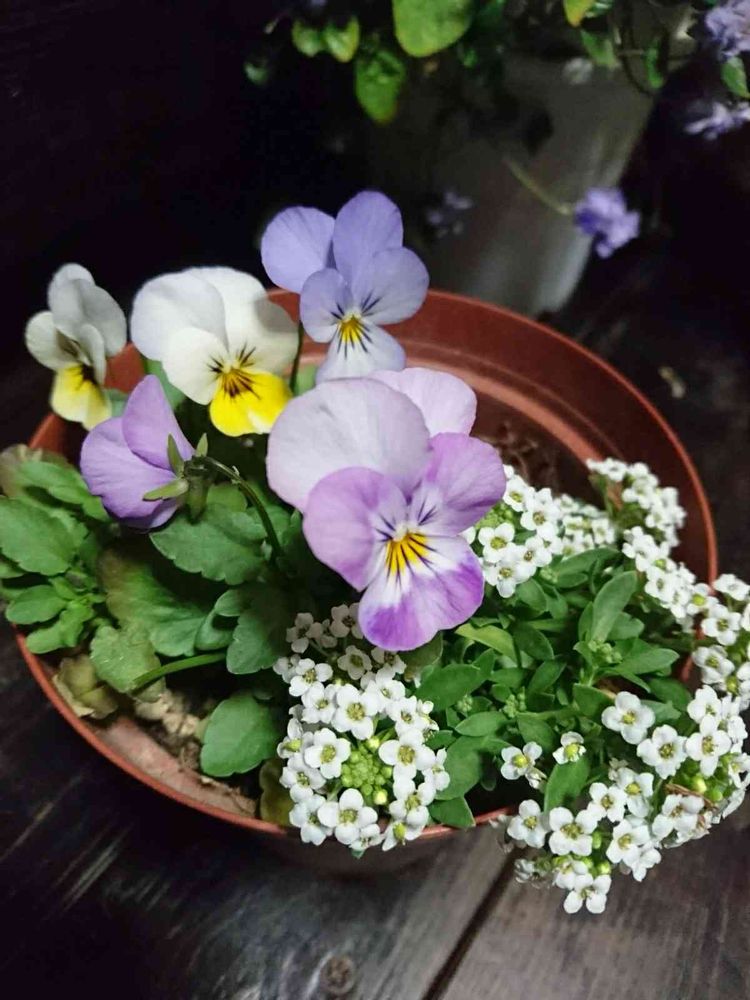 家主が枯れていない鉢から🌱をだし咲いてくれてるビオラとアリッサム。