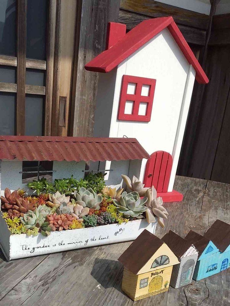 そうね、赤い屋根は確かモップ収納。でも、モップまで見えないし、可愛い。多肉ハウスも可愛いし、小さなハウスもいいね!全部まとめて、ハウス可愛いですよ。沢山いいね!を頂いたから、沢山誉めないと(笑)冗談です。寄せ植えハウス、綺麗に出来ていますね。お友だちも欲しいと言いませんでしたか?