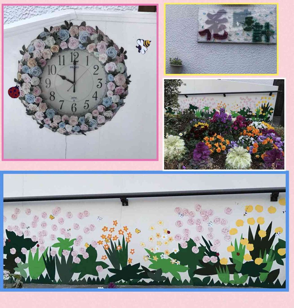「花時計」は高齢者向けのミニデイサービス、乳幼児親子向けの遊び場、喫茶スペース、児童向けの伝統文化継承講座を柱にした、世代間交流型のハウスです。ハウスの周りも花がいっぱい。