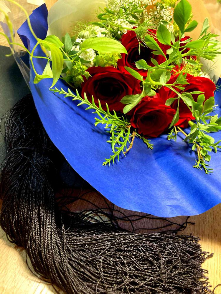 母からお祝いに送っていただいたバラ🌹のブーケと、ハリーポッターのような式服の帽子🎓を記念にpic