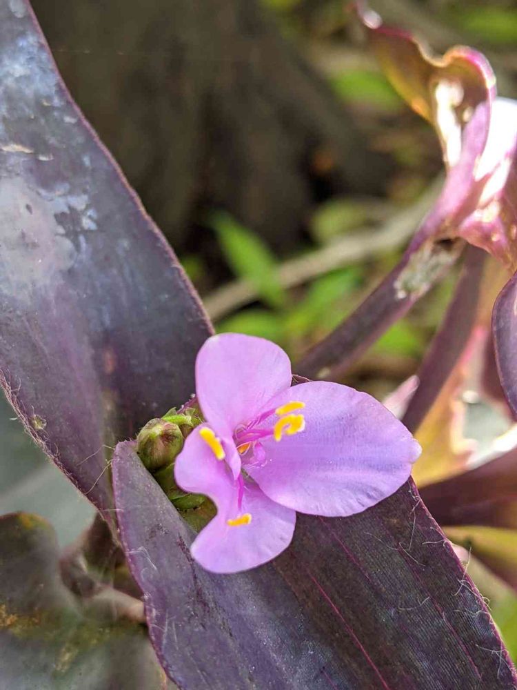 ちょうど家主さんがいらっしゃったので、すかさず…「これ下さい!」と…ok٩(๑❛ᴗ❛๑)۶okで…枝切り取って連れて帰り鉢に植えて…葉っぱも増えて良い感じになった頃、雨☔の日に🐌にやられましたが…何とかお花🌺を咲かせてくれました〜🎶紫💜の葉っぱにピンク💗のお花…可愛すぎます( ´,,•ω•,,`)♡