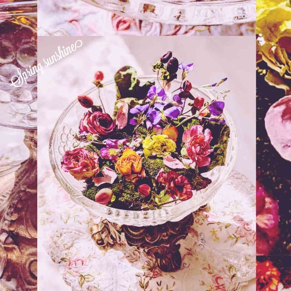 以前に手作りしたドライフラワーを盛り合わせ器へ入れて+窓からの光に当てて撮影し、ひとりでこれだわ、いや〜あれだわ!と想い描きながらpicコラージュ完成🌞💗😑✌️