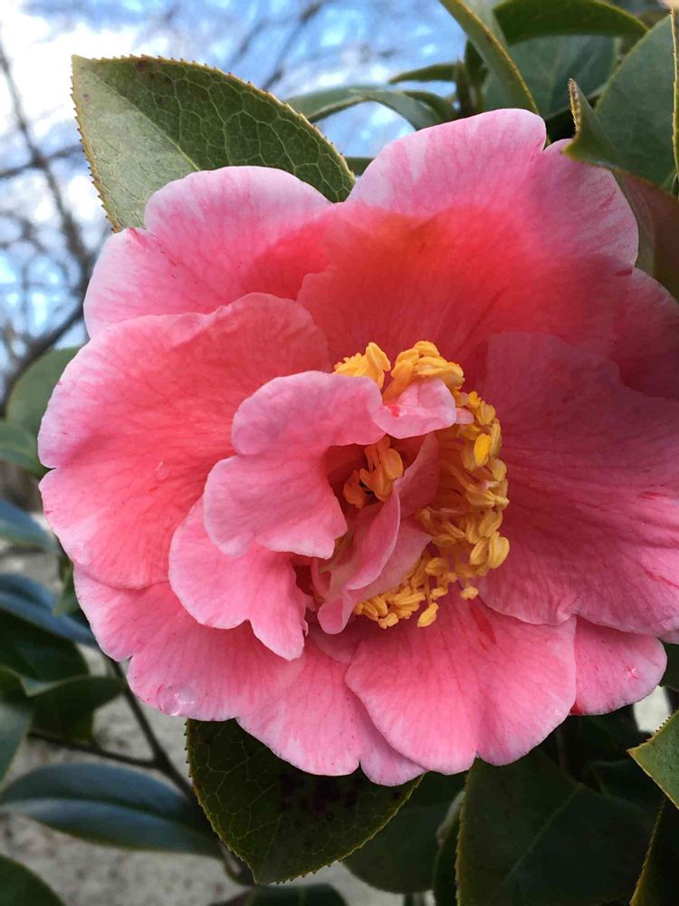 洋種椿。 若木の頃は、整然としていた花弁、ここ数年は 乱れ咲きしています。