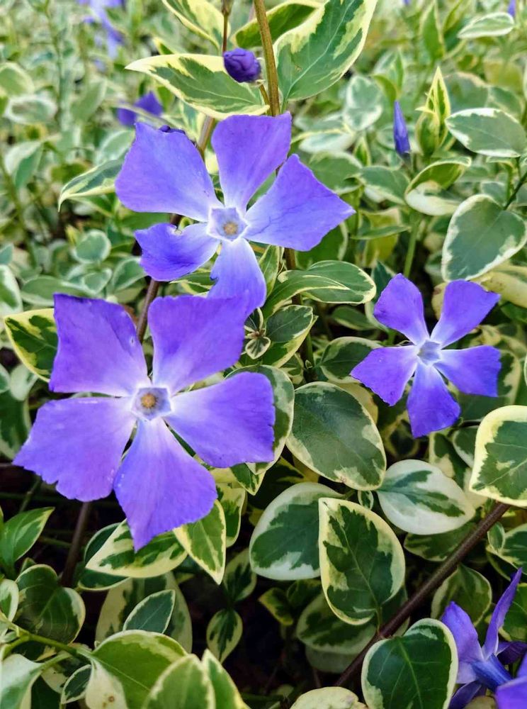 青紫色の斑入り葉ツルニチニチソウの花が沢山咲いて綺麗です💕
